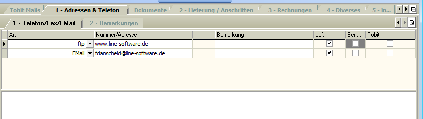 Hier können beliebig viele lieferantenspezifische Telefon - Faxnummer - E-Mail- und Web-Adressen hinterlegt werden.