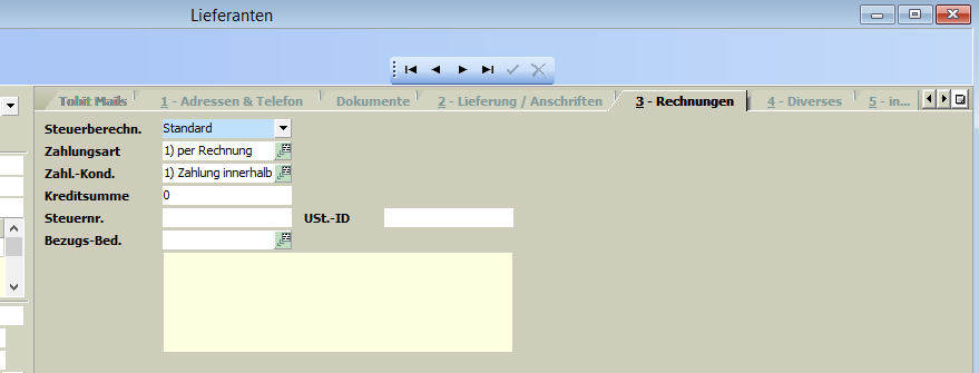 Hier werden die rechnungsrelevanten Daten zum Lieferant hinterlegt, wie Steuerberechnung, Steuernummer, Zahlungsart, Zahlungskonditionen, UST-ID und Bezugsbedingungen