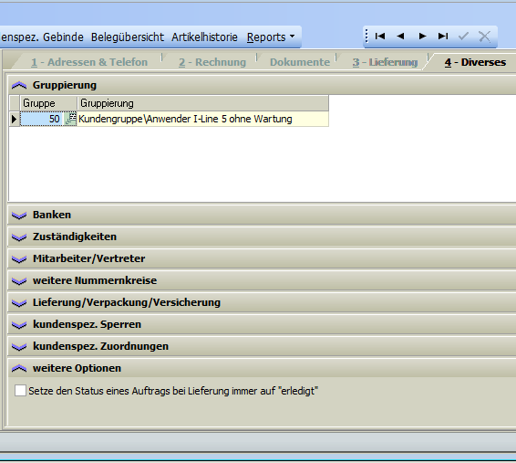 Unter Gruppierung gibt es die Möglichkeit, einem Lieferanten beliebig viele Gruppierungen (diese können im Menue "Einkauf\Basisdaten\Lieferanten-Gruppierungen angelegt und verwaltet werden), zuzuordnen. Diese Zuordnungen stehen in vielen Auswertungsmodulen innerhalb der I-Line 6 als Selektionsmerkmale zur Verfügung.
