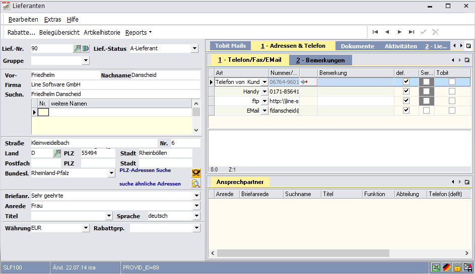 Beliebig viele Ansprechpartner inkl. Telefon etc. sind Im Menue "Ansprechpartner" verwaltbar.