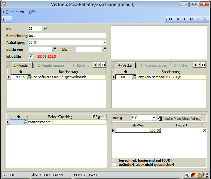 Hier können Positionsrabatte / Zuschläge angelegt und verwaltet werden, die entweder für den ausgewählten Zeitraum gelten,